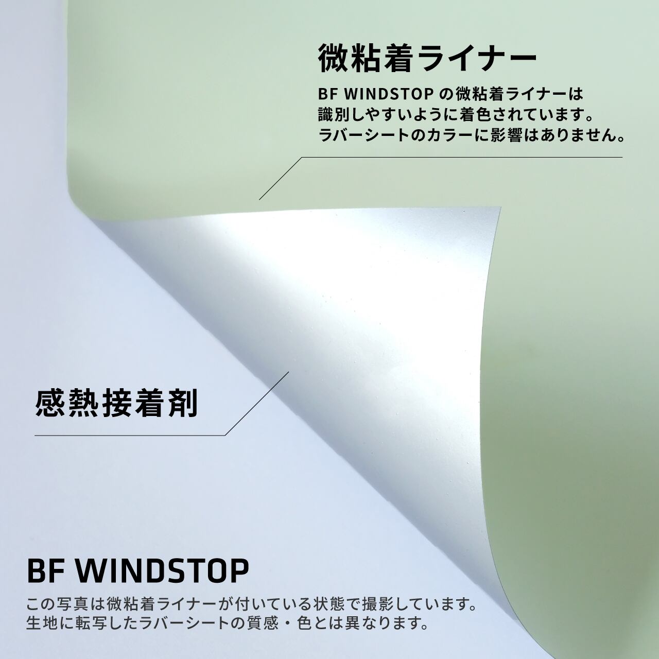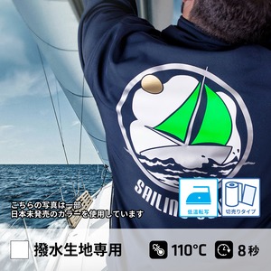 BF WINDSTOP(ビーエフ ウィンドストップ)は、低温圧着+強力タイプの接着剤を使用。転写温度110℃の低温で転写できるため、防水ジャケットや帽子、靴などの合成繊維に名入れやロゴを転写するのに最適な熱転写ラバーシートです。